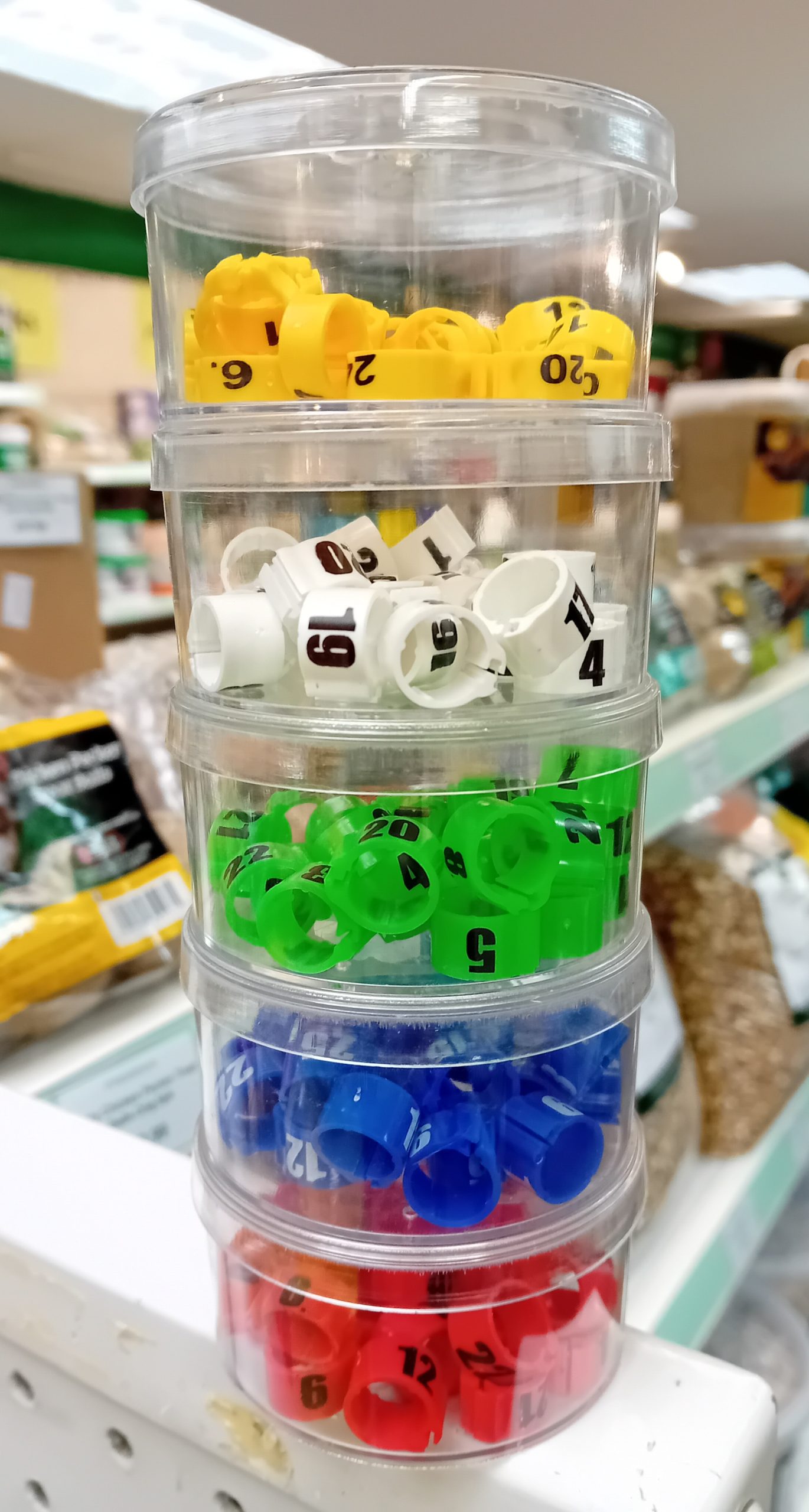 Pigeon numbered leg rings in various colours.